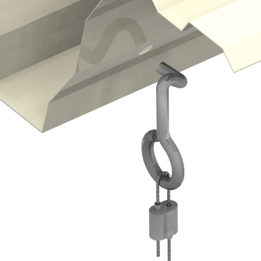 Hak do blachy, np. trapezowej umożliwiający tworzenie indywidualnych zawieszeń o dowolnej długości wraz z linką typu WRA i zaciskami 4S.